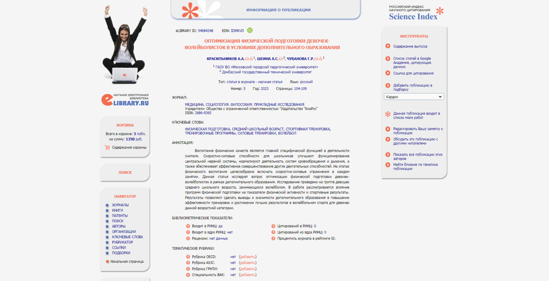 Научная статья "Оптимизация физической подготовки девочек-волейболисток" была успешно внесена в электронную библиотеку Elibrary.